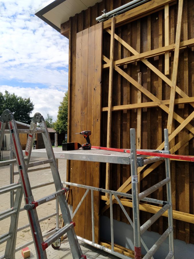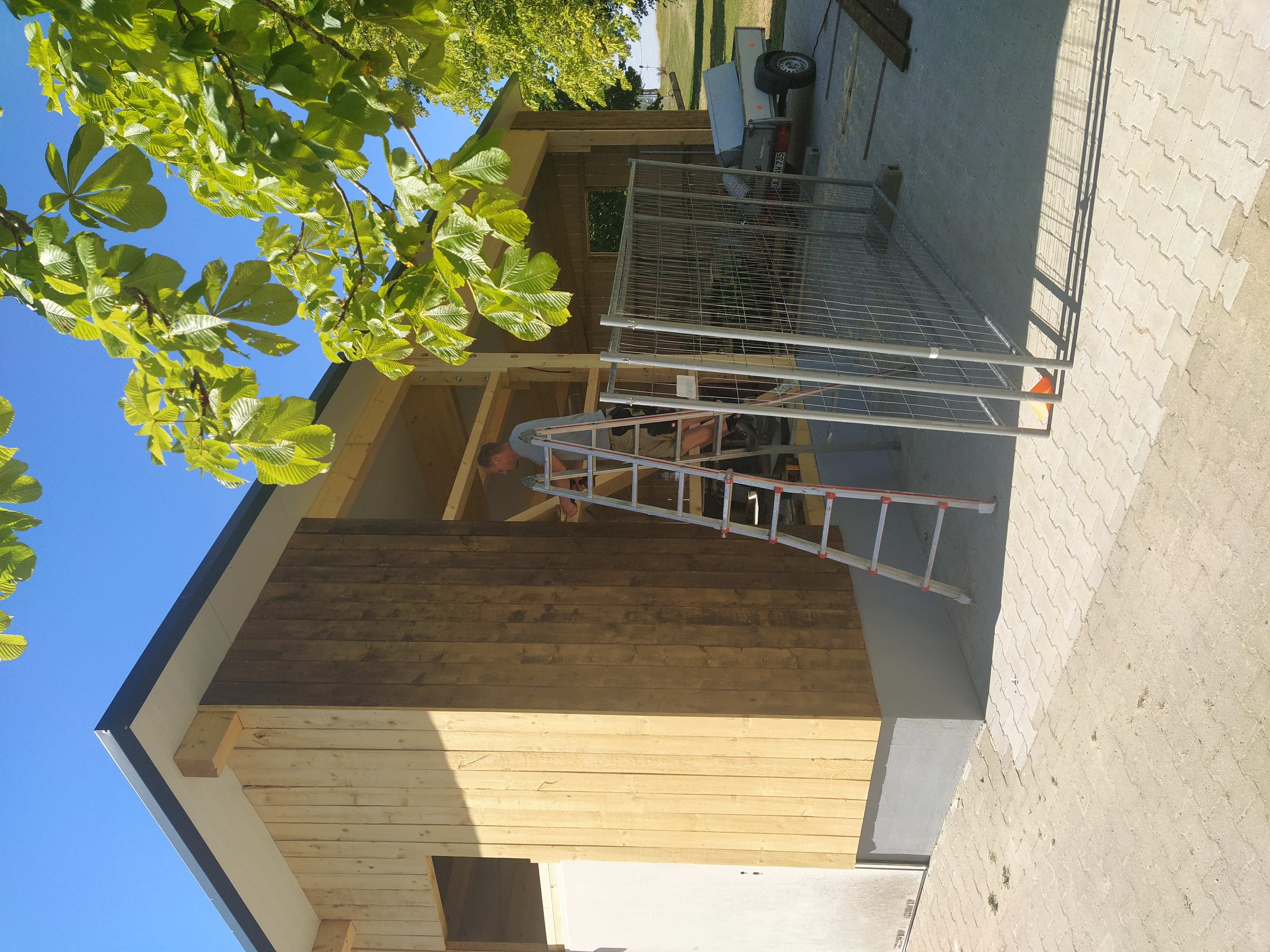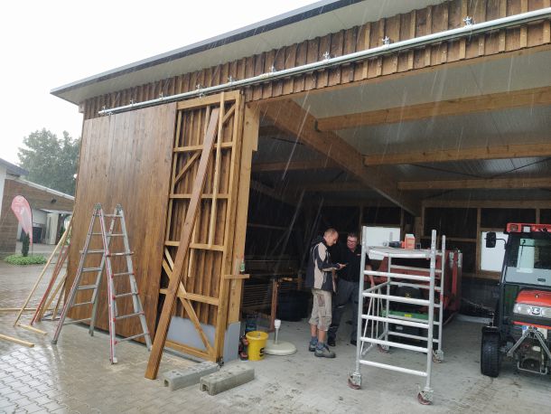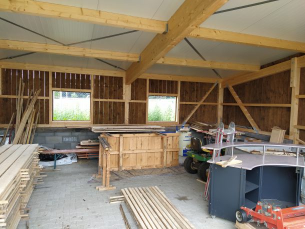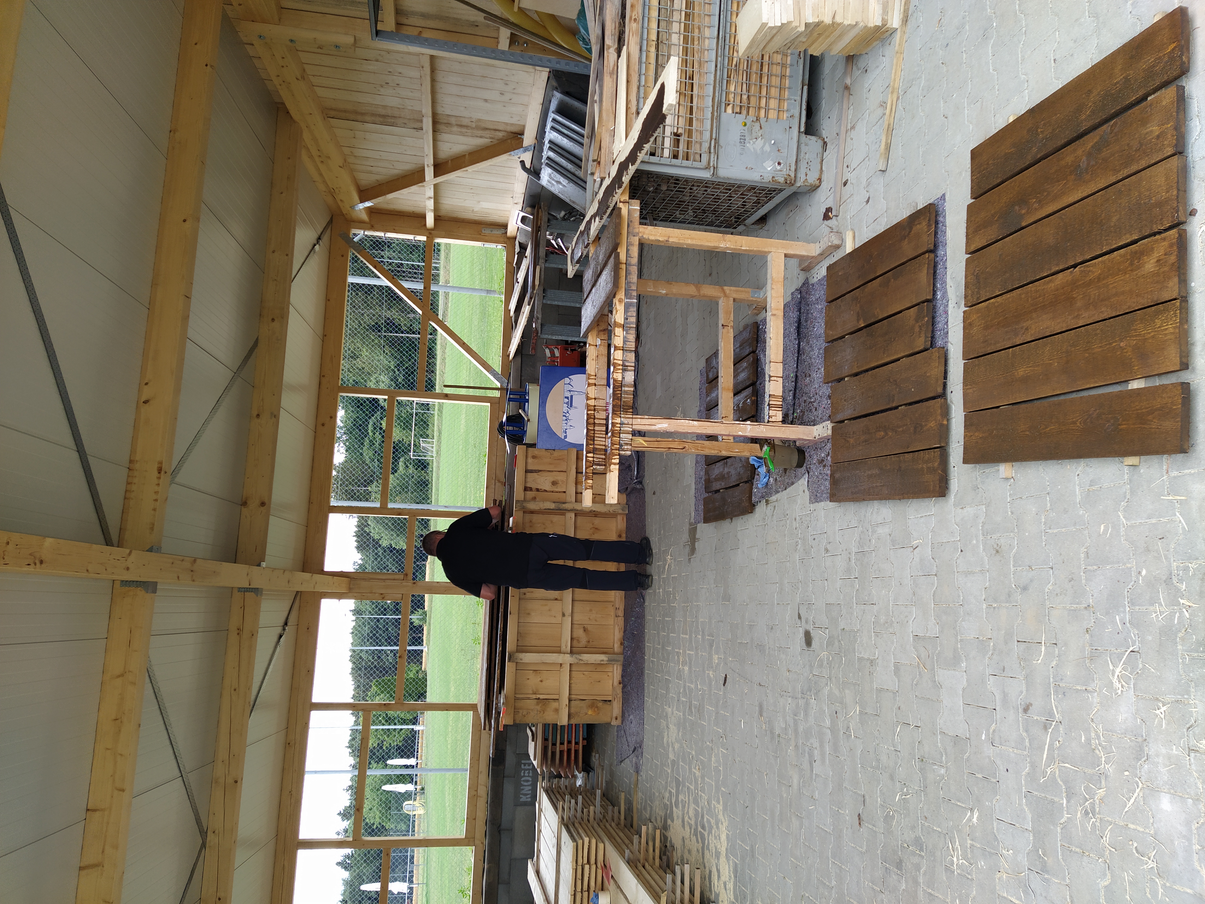 Doch so schnell die Baustelle in diesen 3 Wochen vorangekommen war, so schnell ebbte es auch wieder ab. Großbaustellen, fehlende Sandwichplatten fürs Dach und nicht zuletzt der Winter sorgten für eine vorübergehende Pause. Diese verlängerte sich dann durch den tragischen Tod des Inhabers unserer Zimmerei und vielen damit verbundenen Schwierigkeiten. Unter anderem musste zeitweise der rote Punkt abgegeben werden, um ihn dann einige Wochen später erneut zu erhalten. So erfolgte die Aufrichtung des Schuppens erst am 07. und 08. Juni des Jahres 2022.