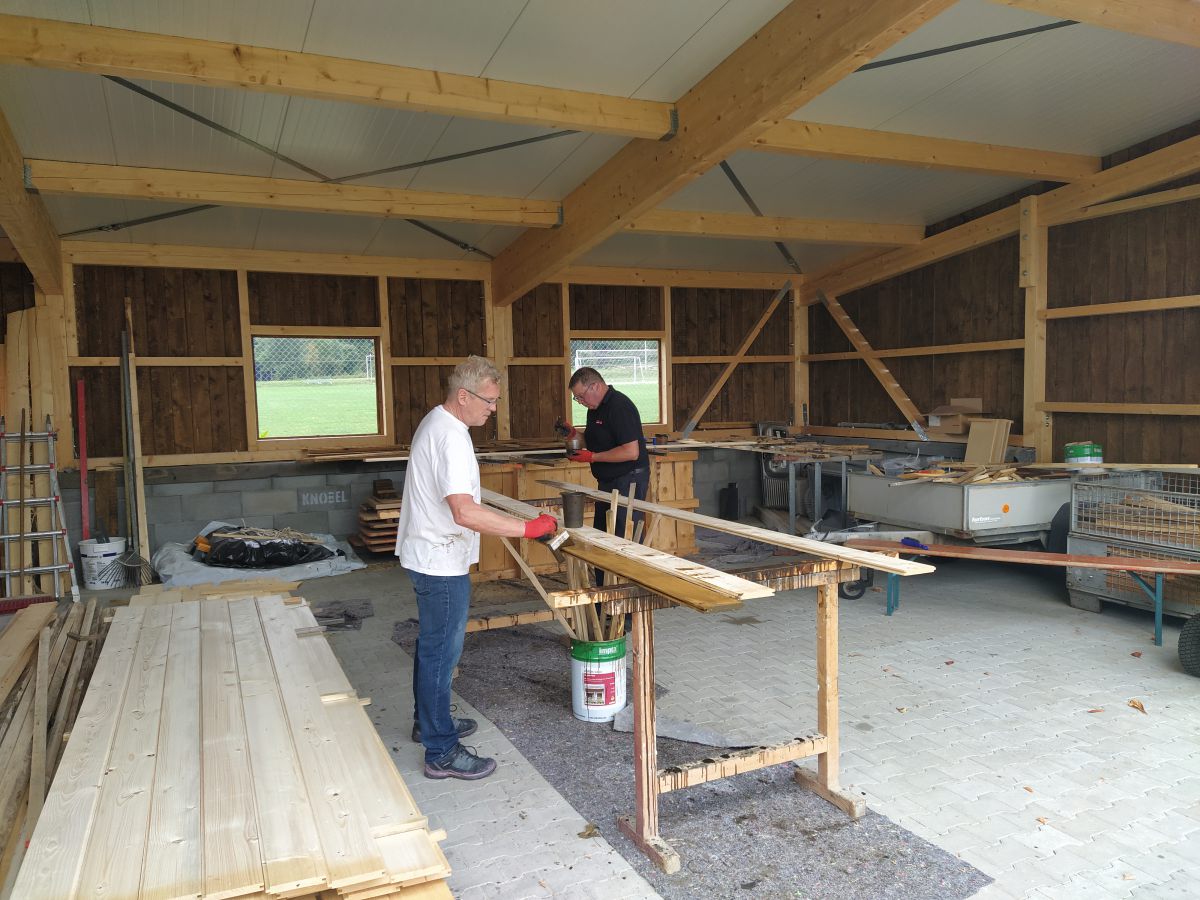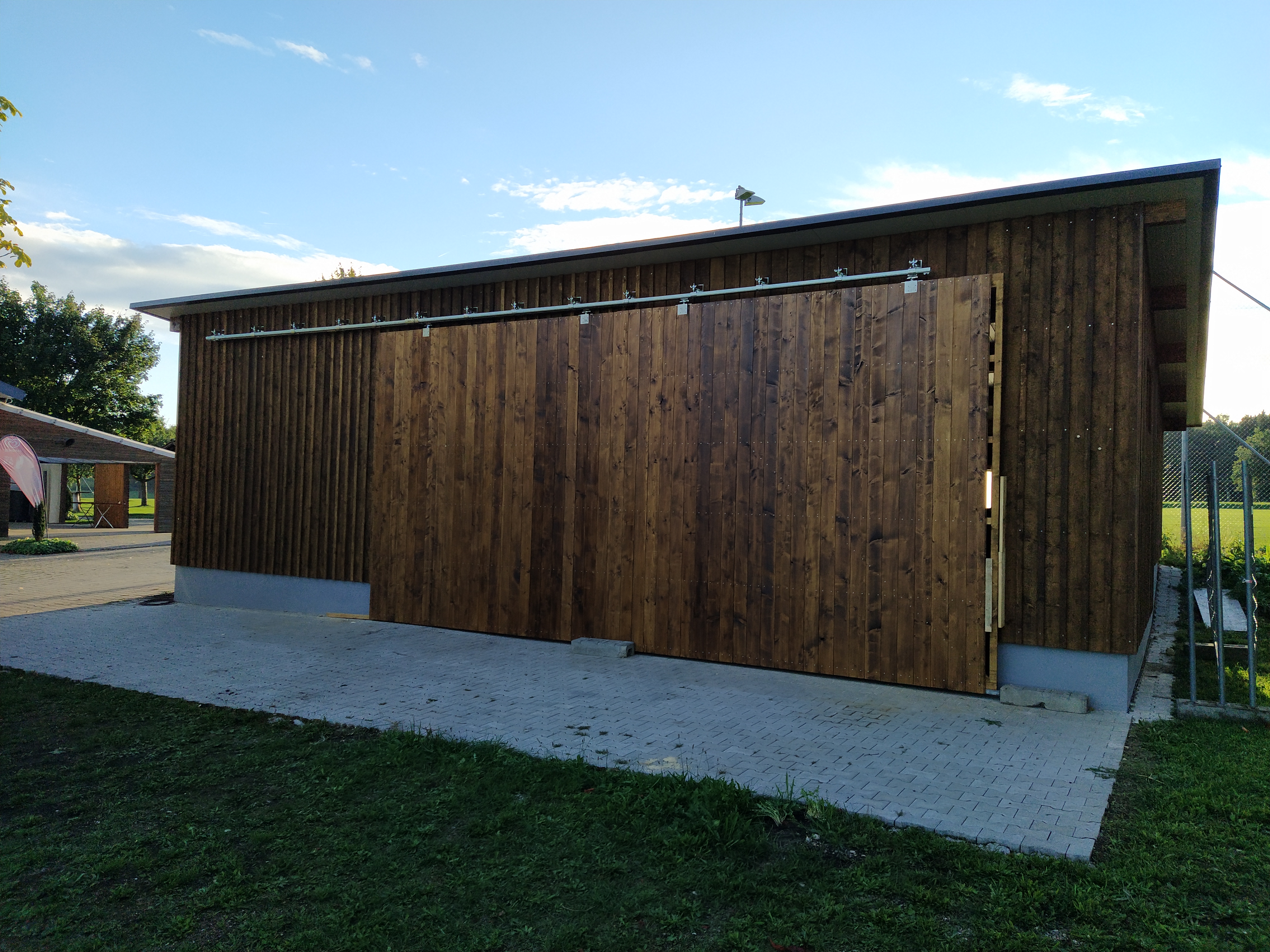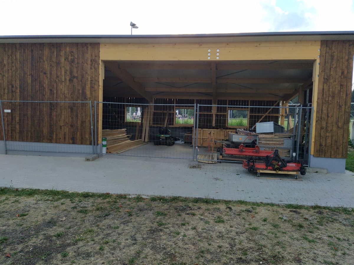 Gerade in der Sommerpause angekommen ging Holger Koch nun voller Tatendrang daran, die Fertigstellung des Schuppens bis Herbst hinzubekommen. Die vom Forstbetrieb Muth gespendeten Bäume gingen ins Sägewerk, wurden dann anschließend gesägt, in unzähligen Stunden angemalt und schließlich angebracht. Fenster und Türen wurden gesetzt und am Schluss die beiden Rolltore gefertigt und installiert. So konnte pünktlich zum einsetzenden Herbst der Schuppen in Betrieb genommen werden, so dass nun alle Maschinen dort stehen wo sie gebraucht werden, um auch in Zukunft für top gepflegte Rasenplätze auf unserem Sportgelände zu sorgen.