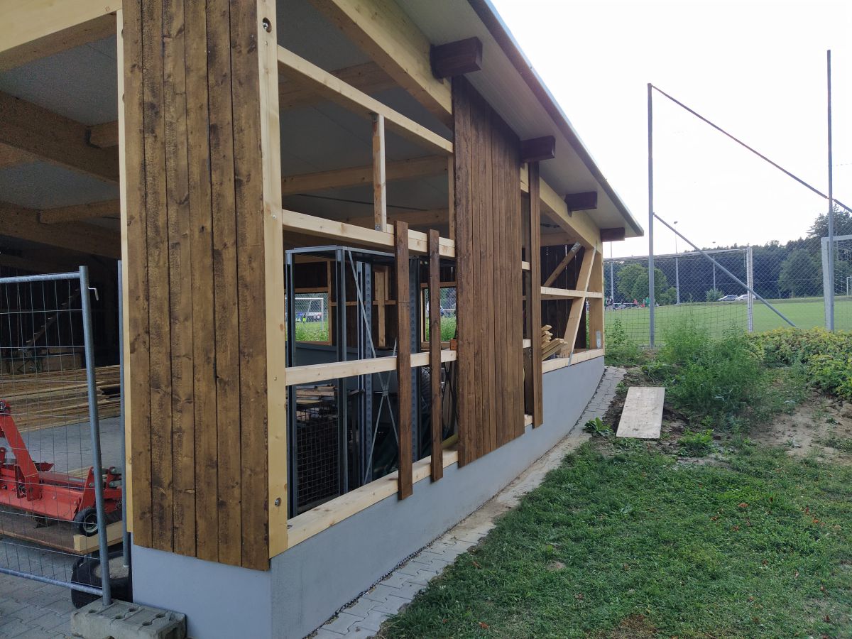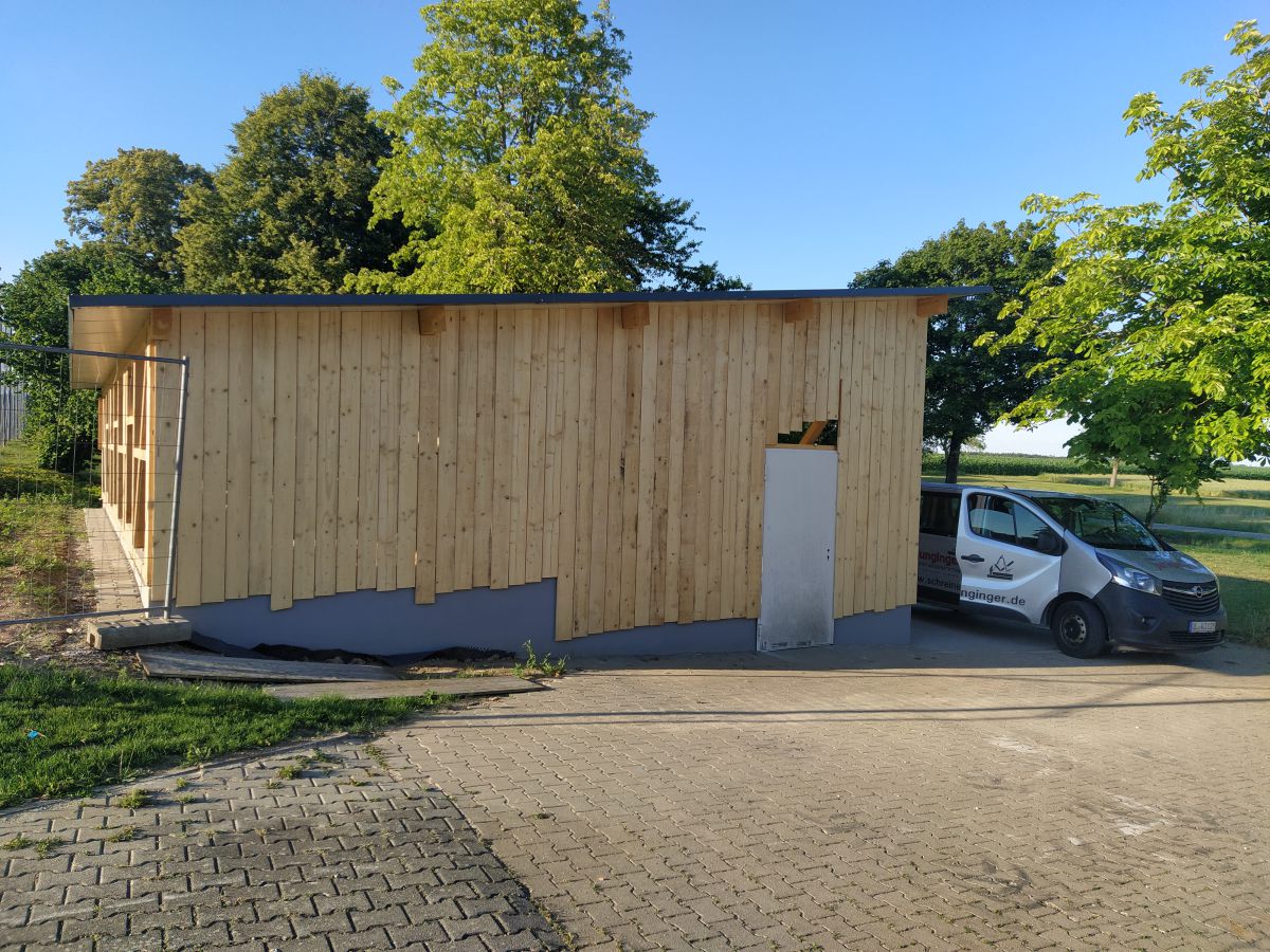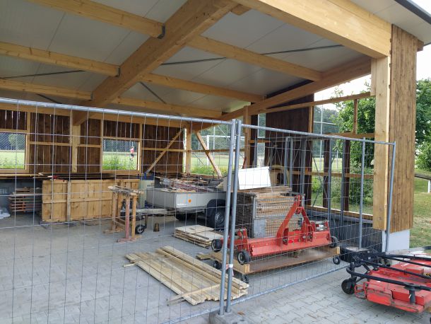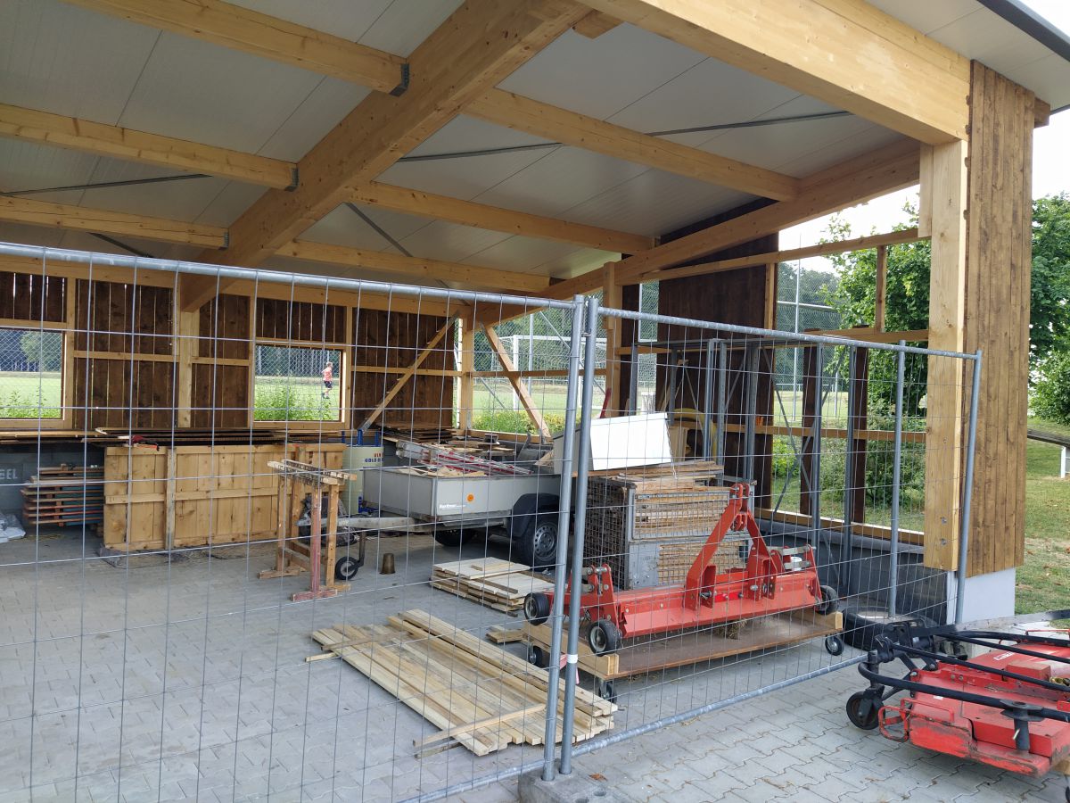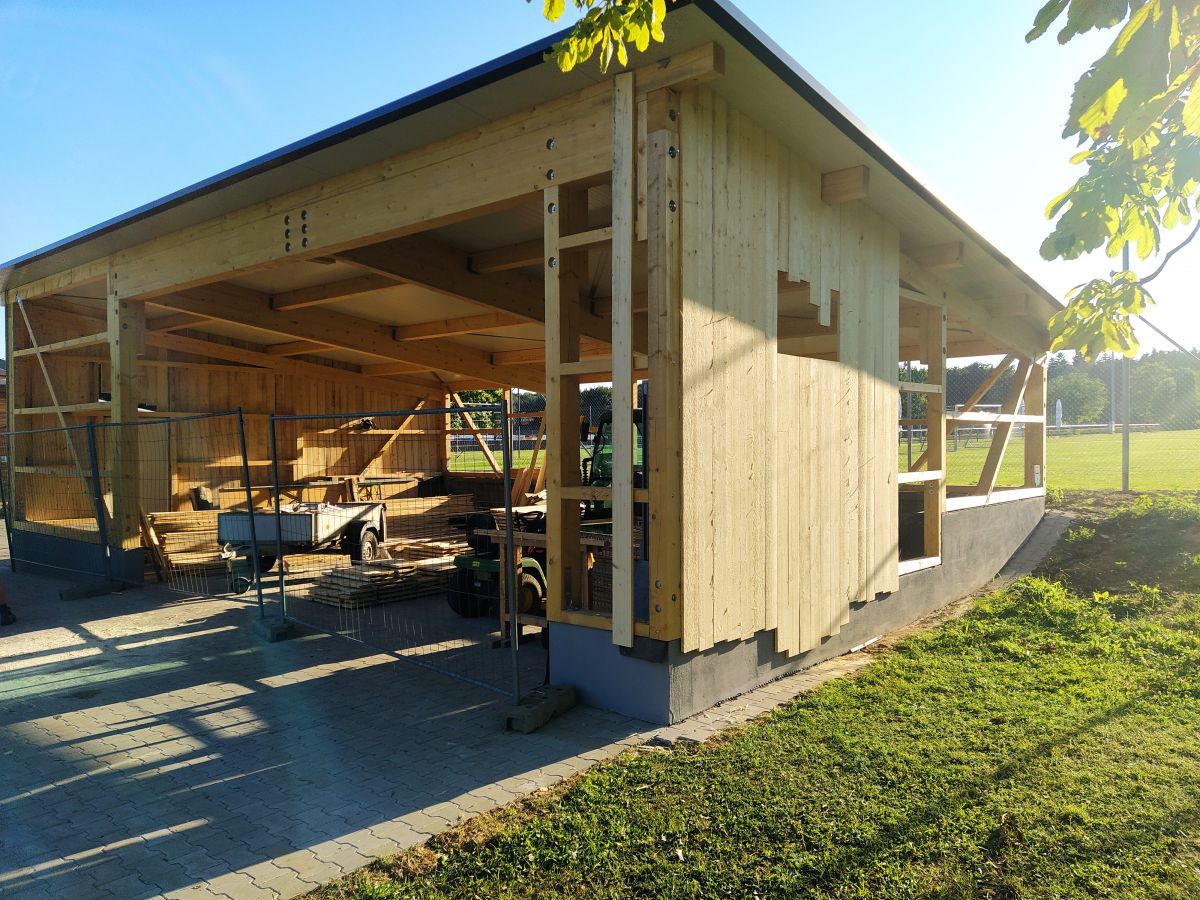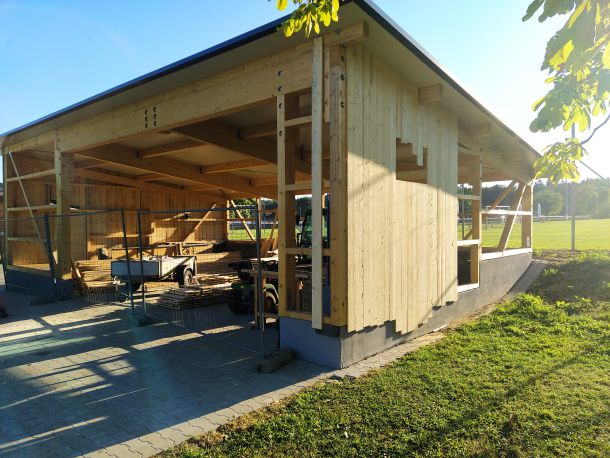 So legte Thomas Kröner dem Ausschuss in der Sitzung vom 29. März 2021 einen Plan zum Bau eines Maschinenschuppens vor. Auch hatte er bereits ein Angebot der Firma Holzbau Max Mayer, Rammingen vorliegen. Da wir uns jedoch inmitten der Corona-Zeit befanden, unterlag dieses Angebot einer Gültigkeit von 6 Wochen. So war jedem klar, je länger wir warten, umso mehr bezahlen wir. Das Holz für die angedachte Deckelschalung würde der Forstbetrieb Muth unserem Bau spenden.