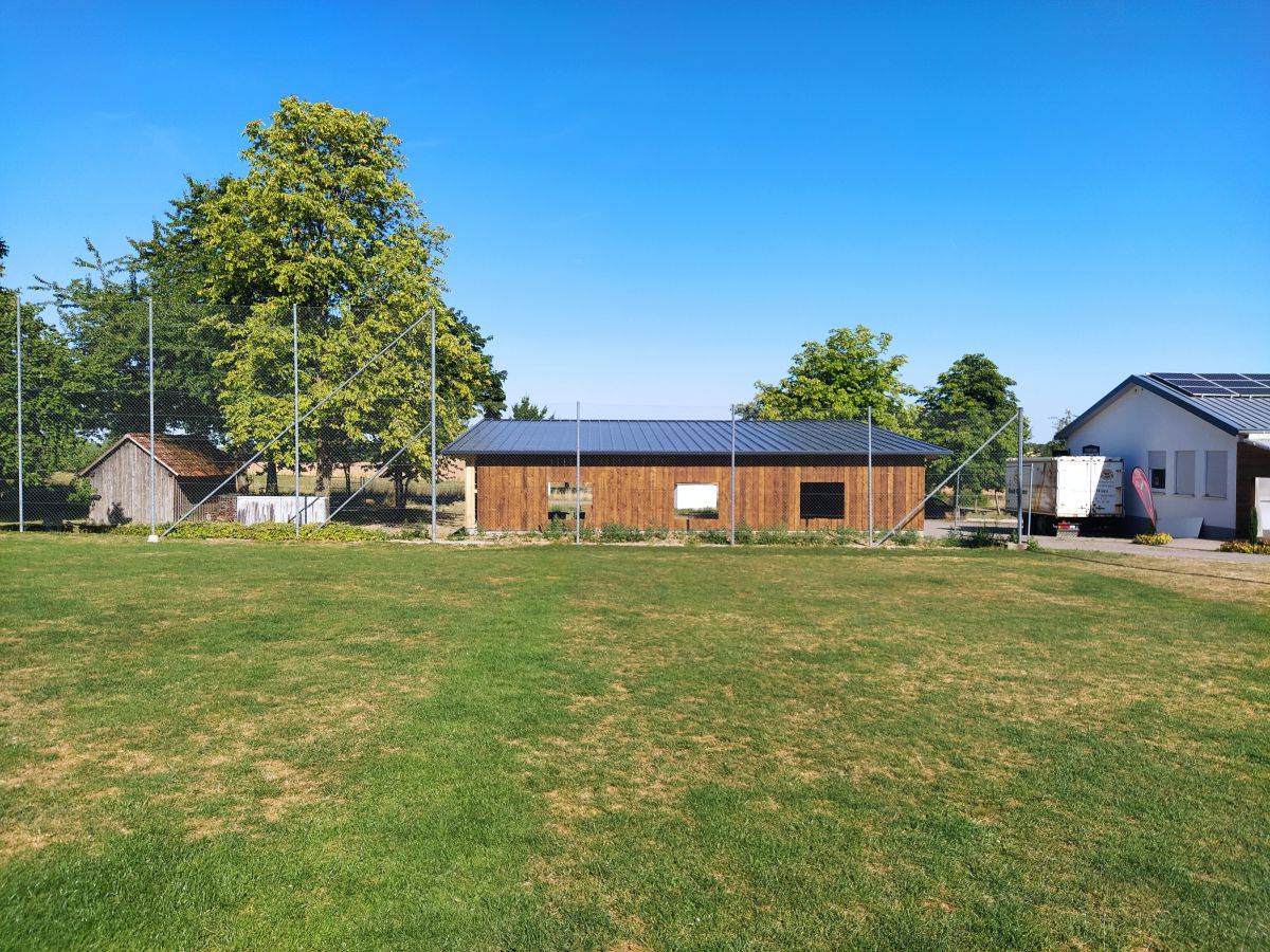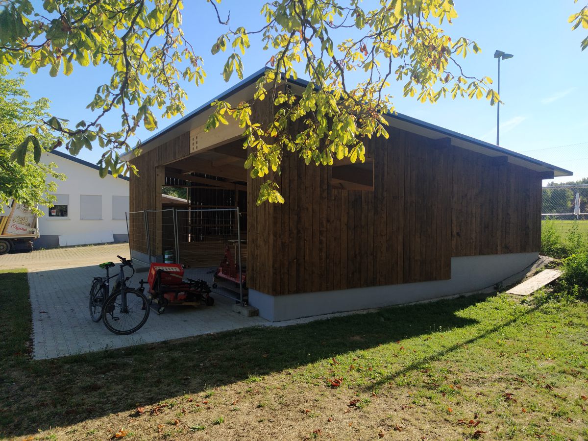 Der Sportverein Ballendorf 1952 e.V. darf sich nun Besitzer eines Maschinenschuppens für seine Rasenpflegegeräte nennen. Dieser bietet Platz für unseren Spindelrasenmäher, den Aufsitzrasenmäher, den Kompakttraktor sowie alle Gerätschaften wie Kehrmaschine, Locher, Striegel, Vertikutiereinheit, etc. Wenn man den Stimmen der Mitglieder trauen darf, dann ist der überwiegende Teil sehr zufrieden mit dem Bau. Größe, Architektur, Eingliederung ins Landschaftsbild, alles scheint harmonisch und passend zu sein. Mit diesem Artikel wollen wir nun abschließend für alle Interessierten zusammenfassen, wie es zum Bau kam und welche Hindernisse „umschifft“ werden mussten.