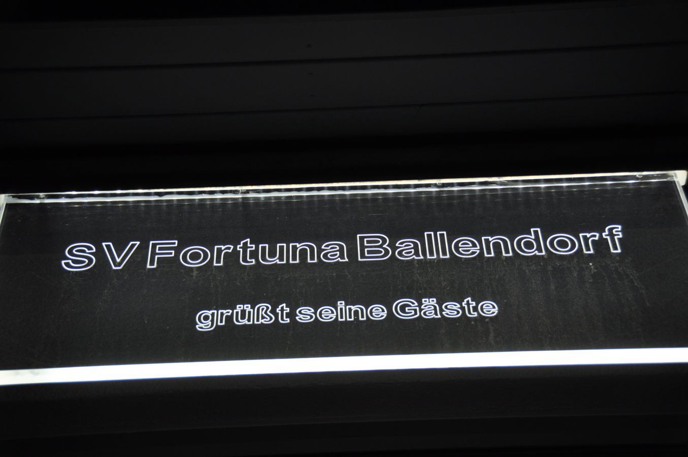 Über der Theke sowie überhalb der Schiebetür sind Pokale und Meisterschafts-Wimpel zu sehen, die von vergangenen sportlichen Erfolgen des Sportvereins Fortuna Ballendorf berichten.