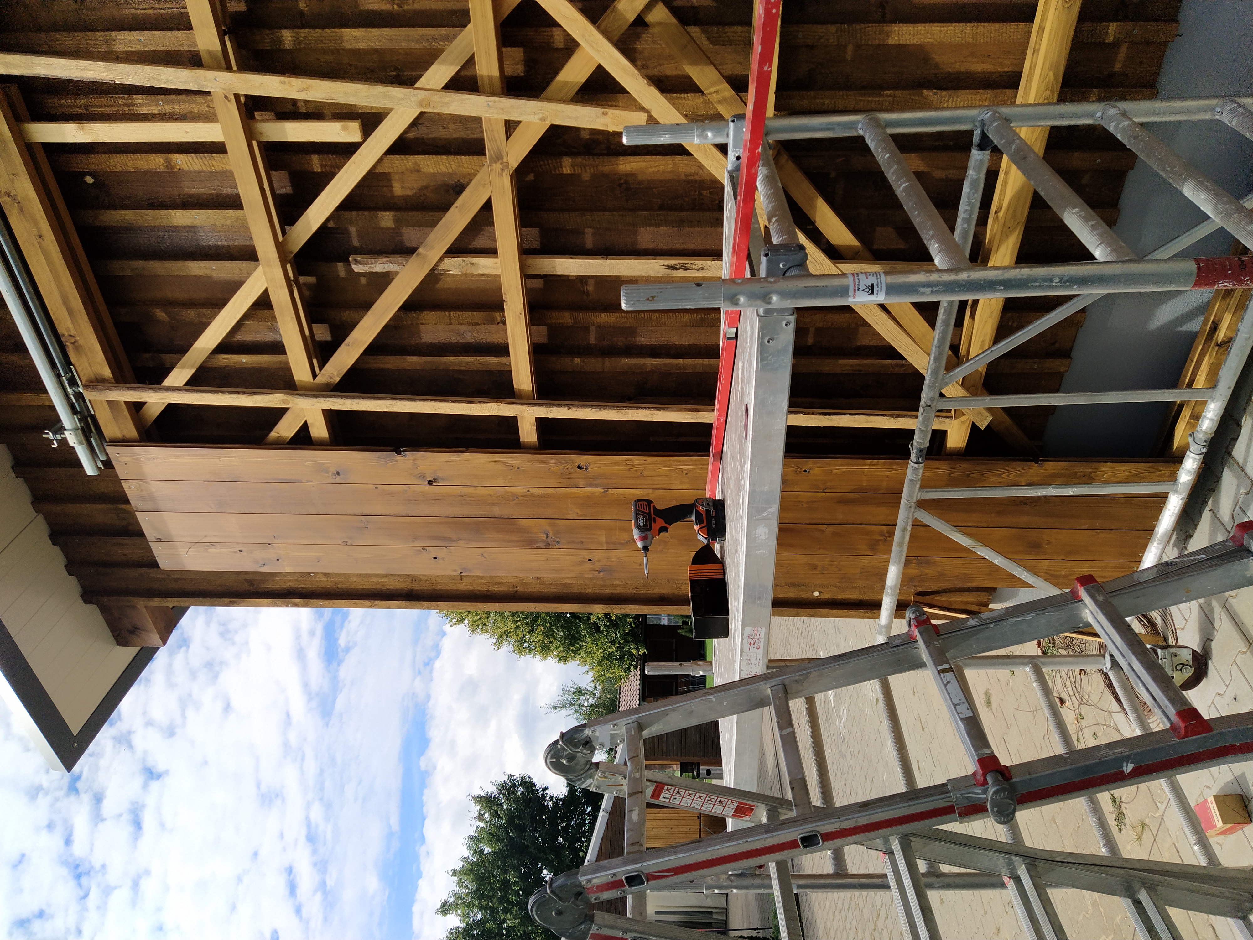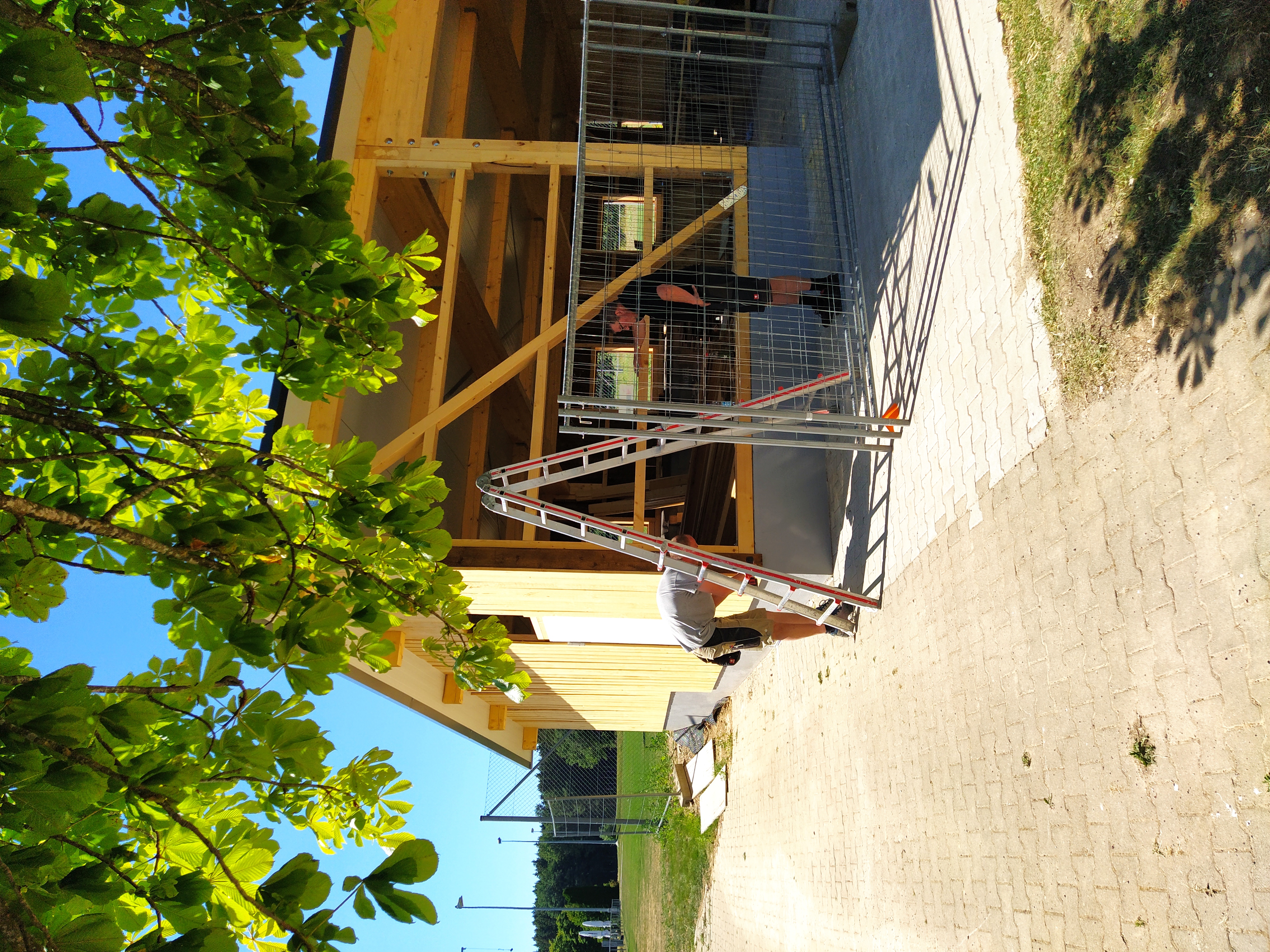 Doch so schnell die Baustelle in diesen 3 Wochen vorangekommen war, so schnell ebbte es auch wieder ab. Großbaustellen, fehlende Sandwichplatten fürs Dach und nicht zuletzt der Winter sorgten für eine vorübergehende Pause. Diese verlängerte sich dann durch den tragischen Tod des Inhabers unserer Zimmerei und vielen damit verbundenen Schwierigkeiten. Unter anderem musste zeitweise der rote Punkt abgegeben werden, um ihn dann einige Wochen später erneut zu erhalten. So erfolgte die Aufrichtung des Schuppens erst am 07. und 08. Juni des Jahres 2022.