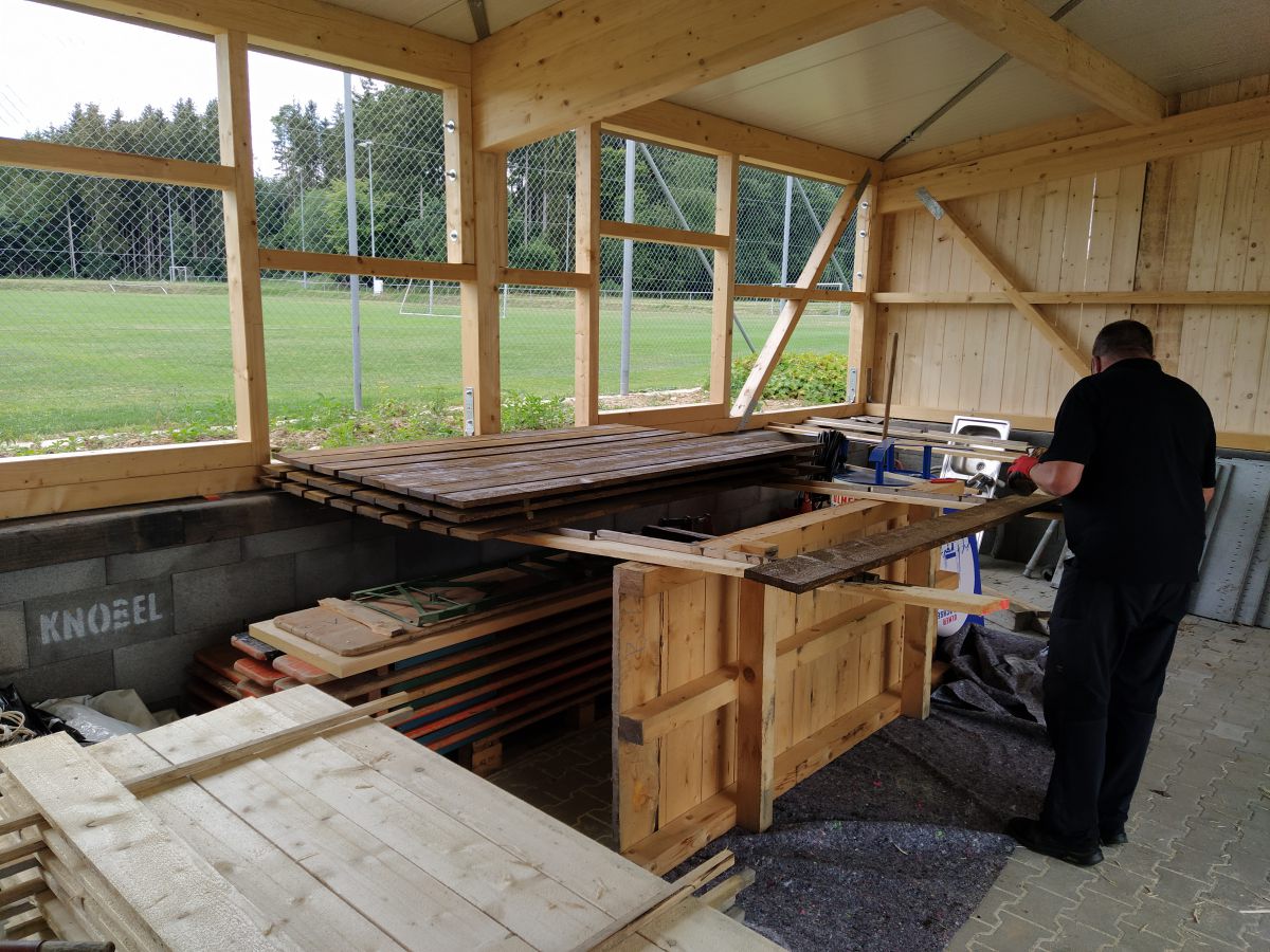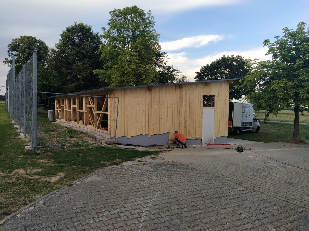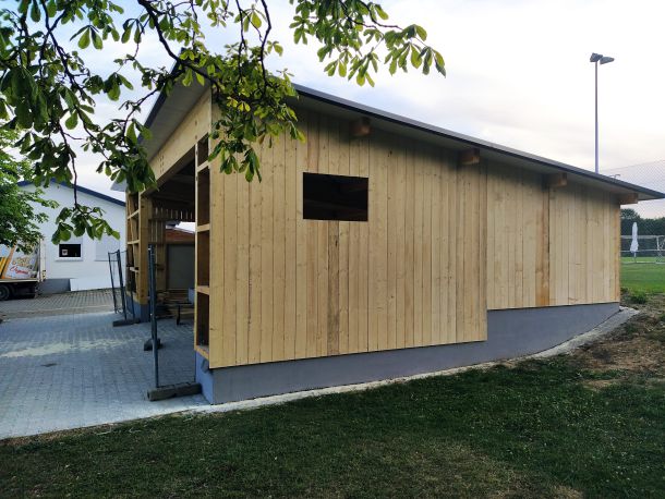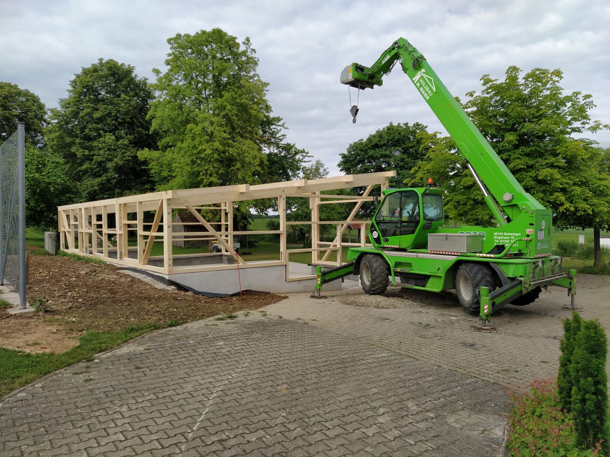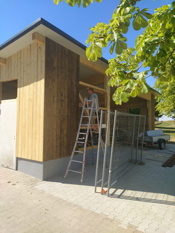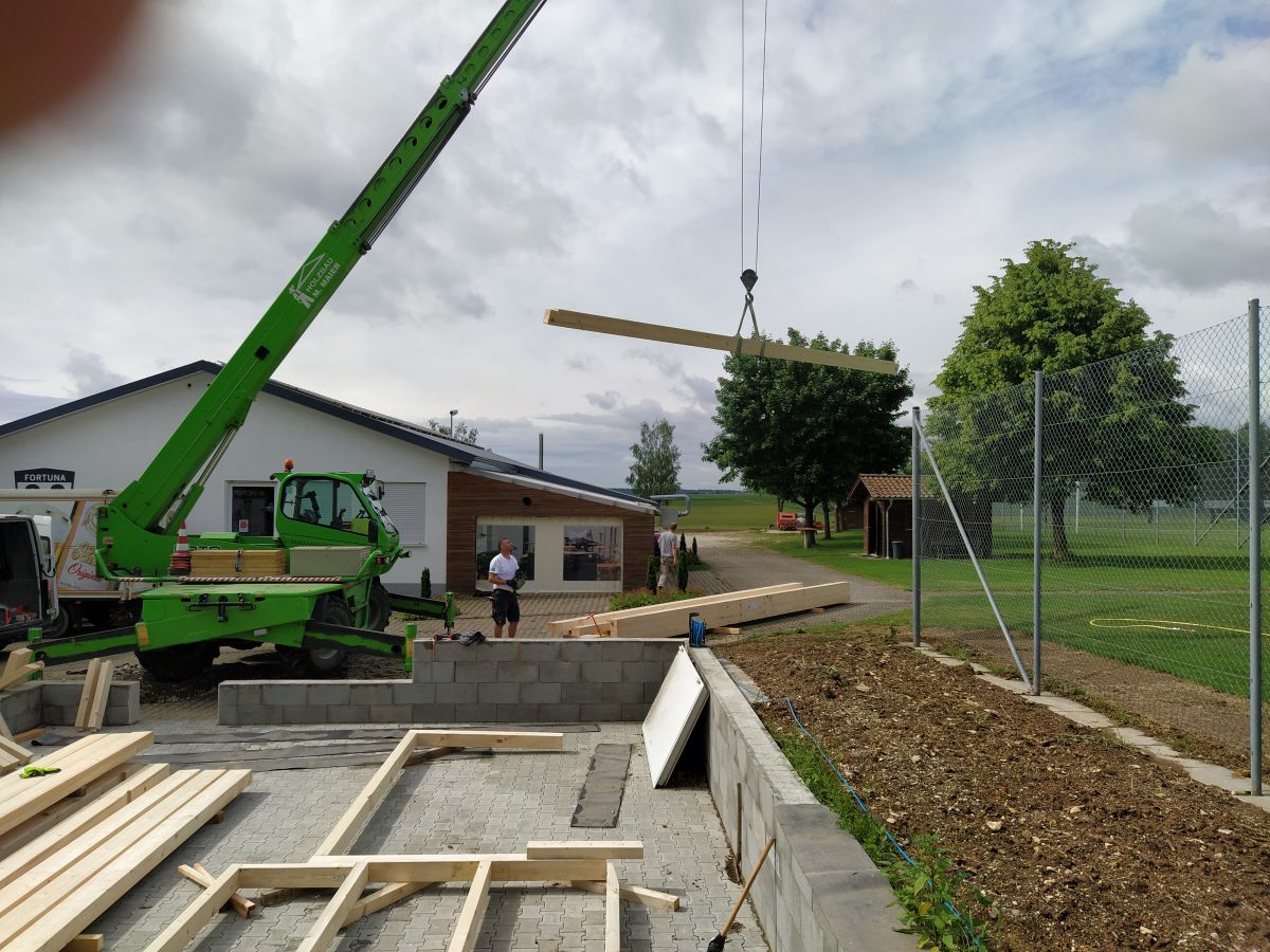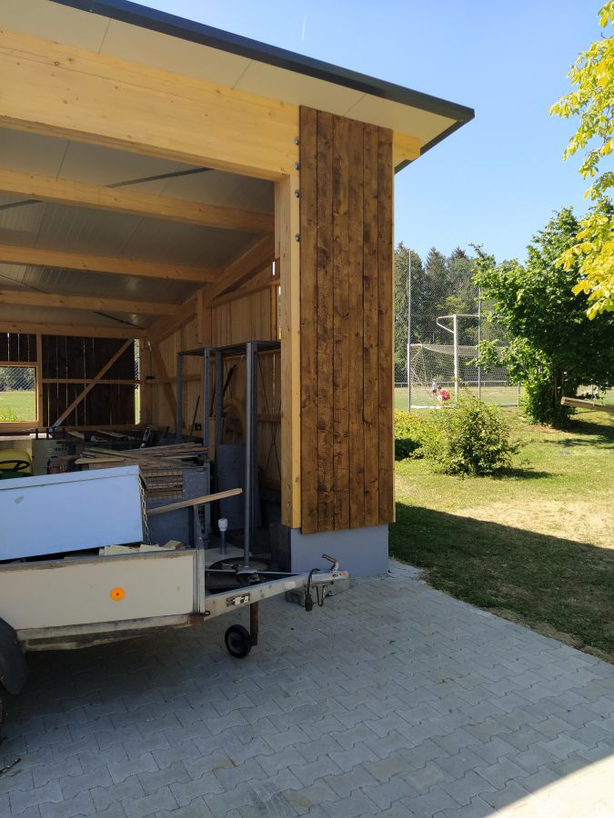 So legte Thomas Kröner dem Ausschuss in der Sitzung vom 29. März 2021 einen Plan zum Bau eines Maschinenschuppens vor. Auch hatte er bereits ein Angebot der Firma Holzbau Max Mayer, Rammingen vorliegen. Da wir uns jedoch inmitten der Corona-Zeit befanden, unterlag dieses Angebot einer Gültigkeit von 6 Wochen. So war jedem klar, je länger wir warten, umso mehr bezahlen wir. Das Holz für die angedachte Deckelschalung würde der Forstbetrieb Muth unserem Bau spenden.