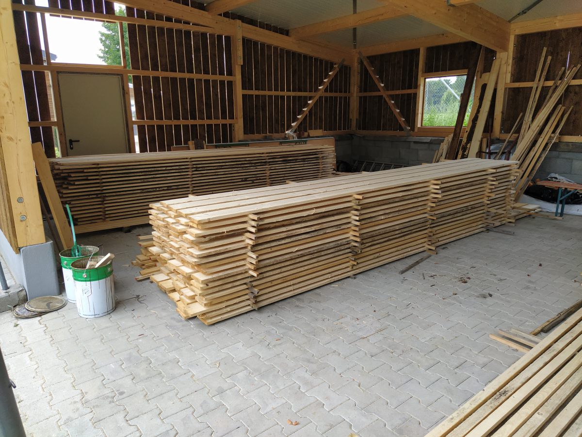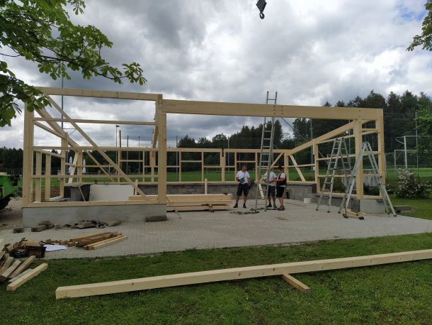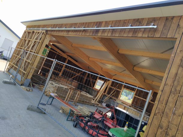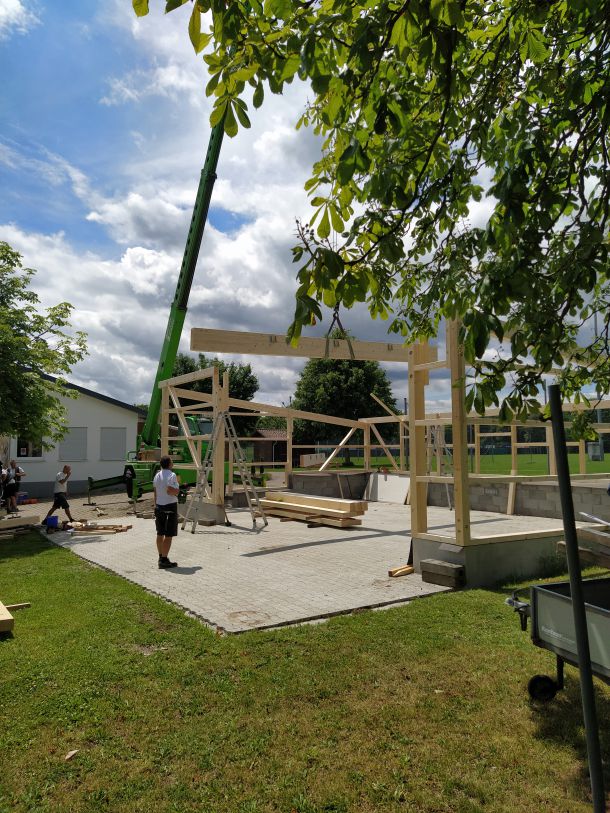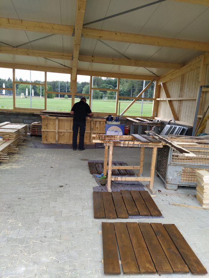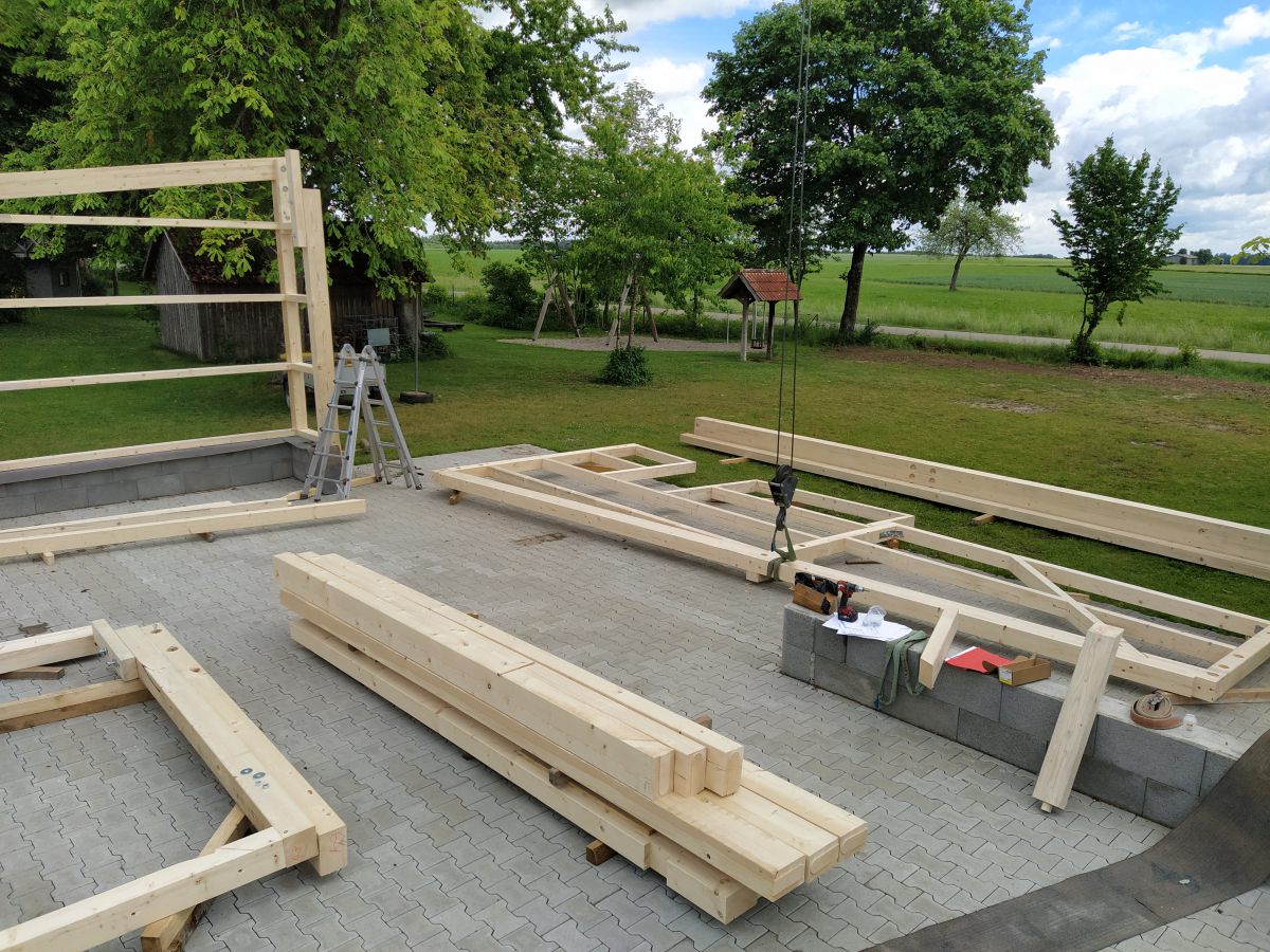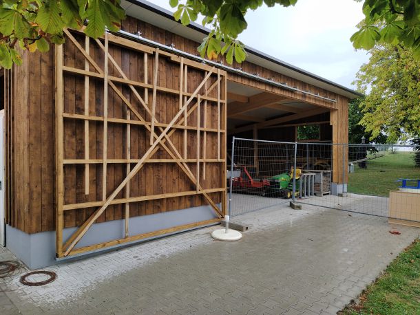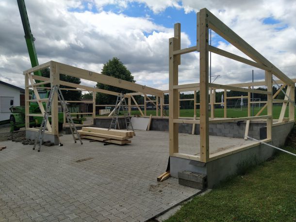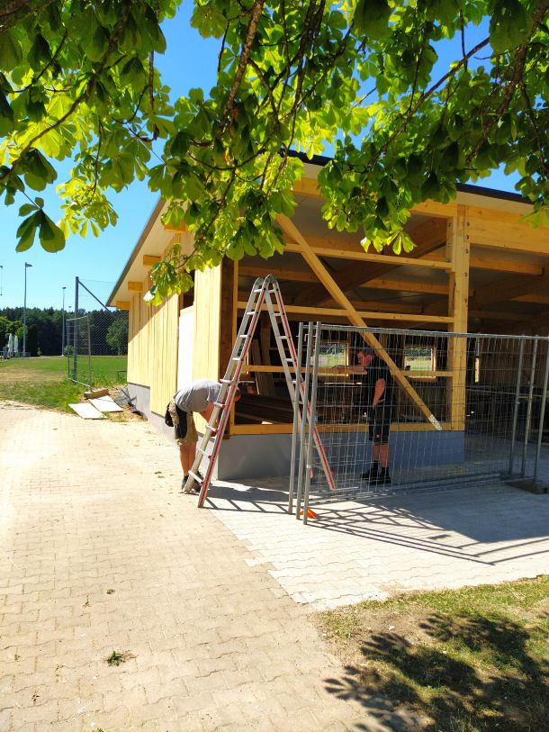 So legte Thomas Kröner dem Ausschuss in der Sitzung vom 29. März 2021 einen Plan zum Bau eines Maschinenschuppens vor. Auch hatte er bereits ein Angebot der Firma Holzbau Max Mayer, Rammingen vorliegen. Da wir uns jedoch inmitten der Corona-Zeit befanden, unterlag dieses Angebot einer Gültigkeit von 6 Wochen. So war jedem klar, je länger wir warten, umso mehr bezahlen wir. Das Holz für die angedachte Deckelschalung würde der Forstbetrieb Muth unserem Bau spenden.