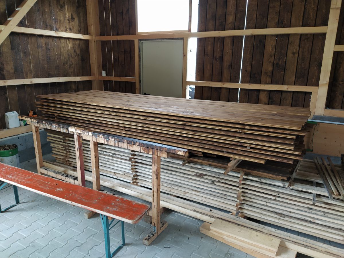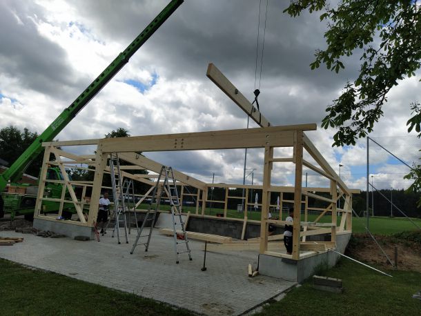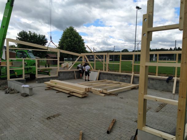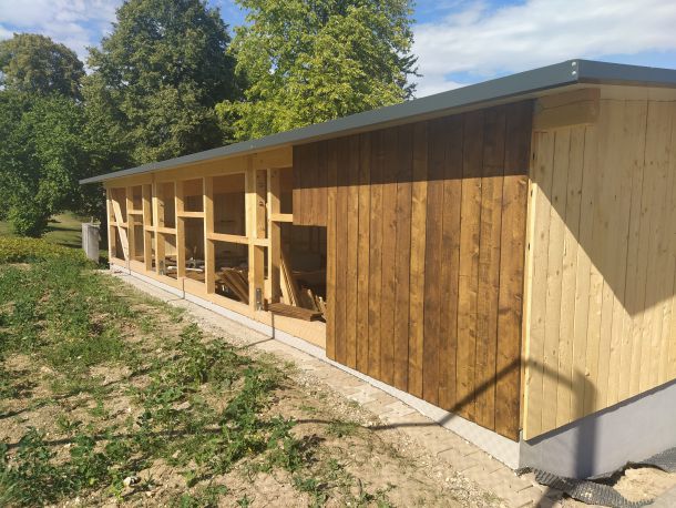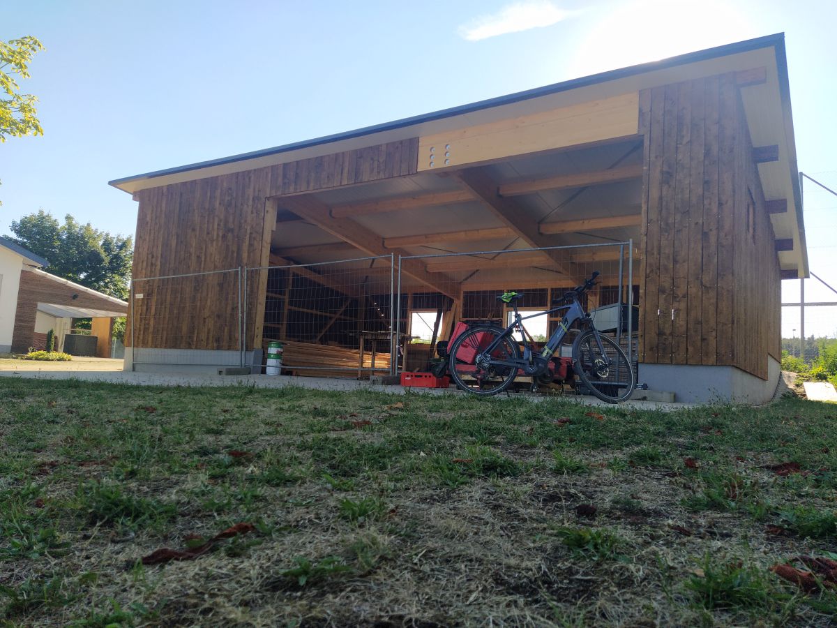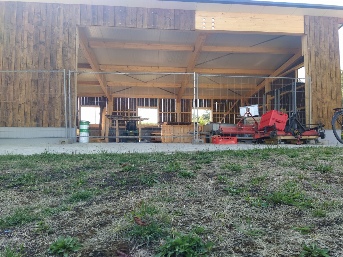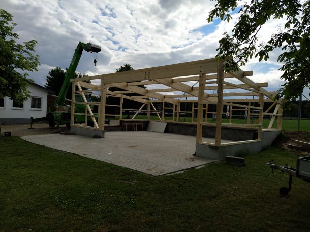 Doch so schnell die Baustelle in diesen 3 Wochen vorangekommen war, so schnell ebbte es auch wieder ab. Großbaustellen, fehlende Sandwichplatten fürs Dach und nicht zuletzt der Winter sorgten für eine vorübergehende Pause. Diese verlängerte sich dann durch den tragischen Tod des Inhabers unserer Zimmerei und vielen damit verbundenen Schwierigkeiten. Unter anderem musste zeitweise der rote Punkt abgegeben werden, um ihn dann einige Wochen später erneut zu erhalten. So erfolgte die Aufrichtung des Schuppens erst am 07. und 08. Juni des Jahres 2022.