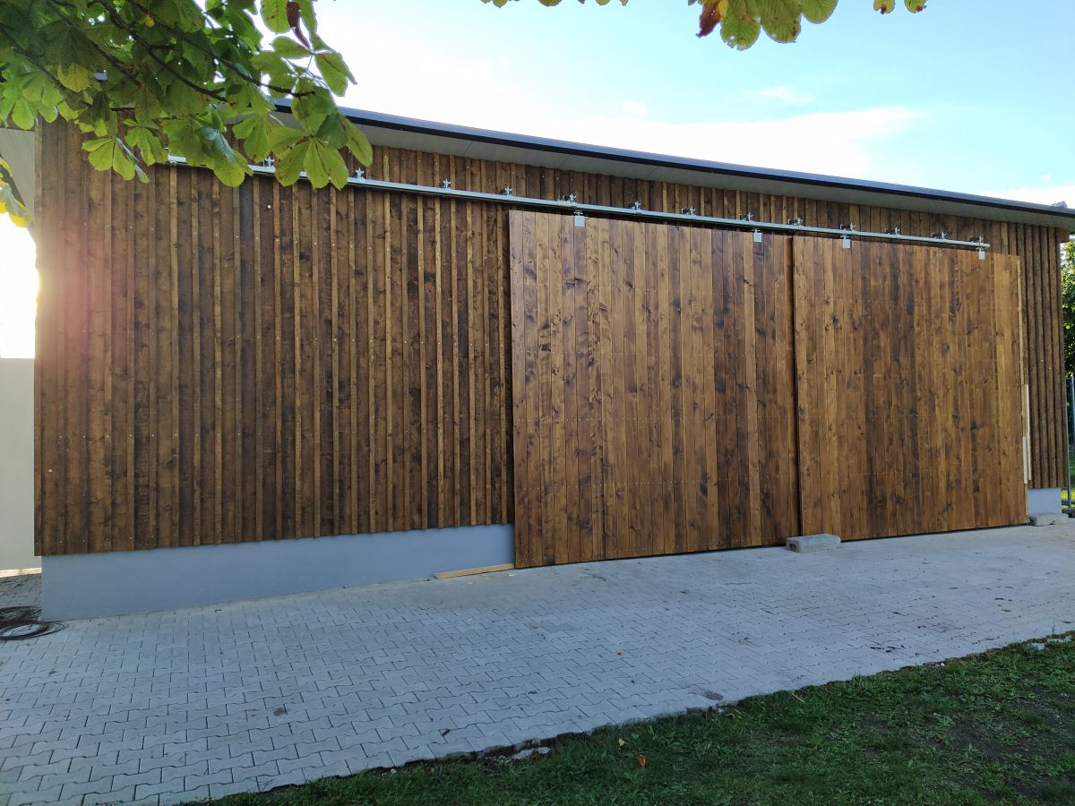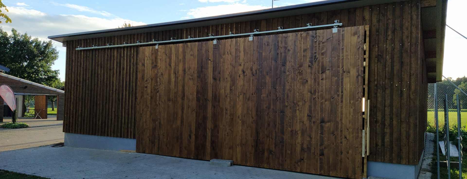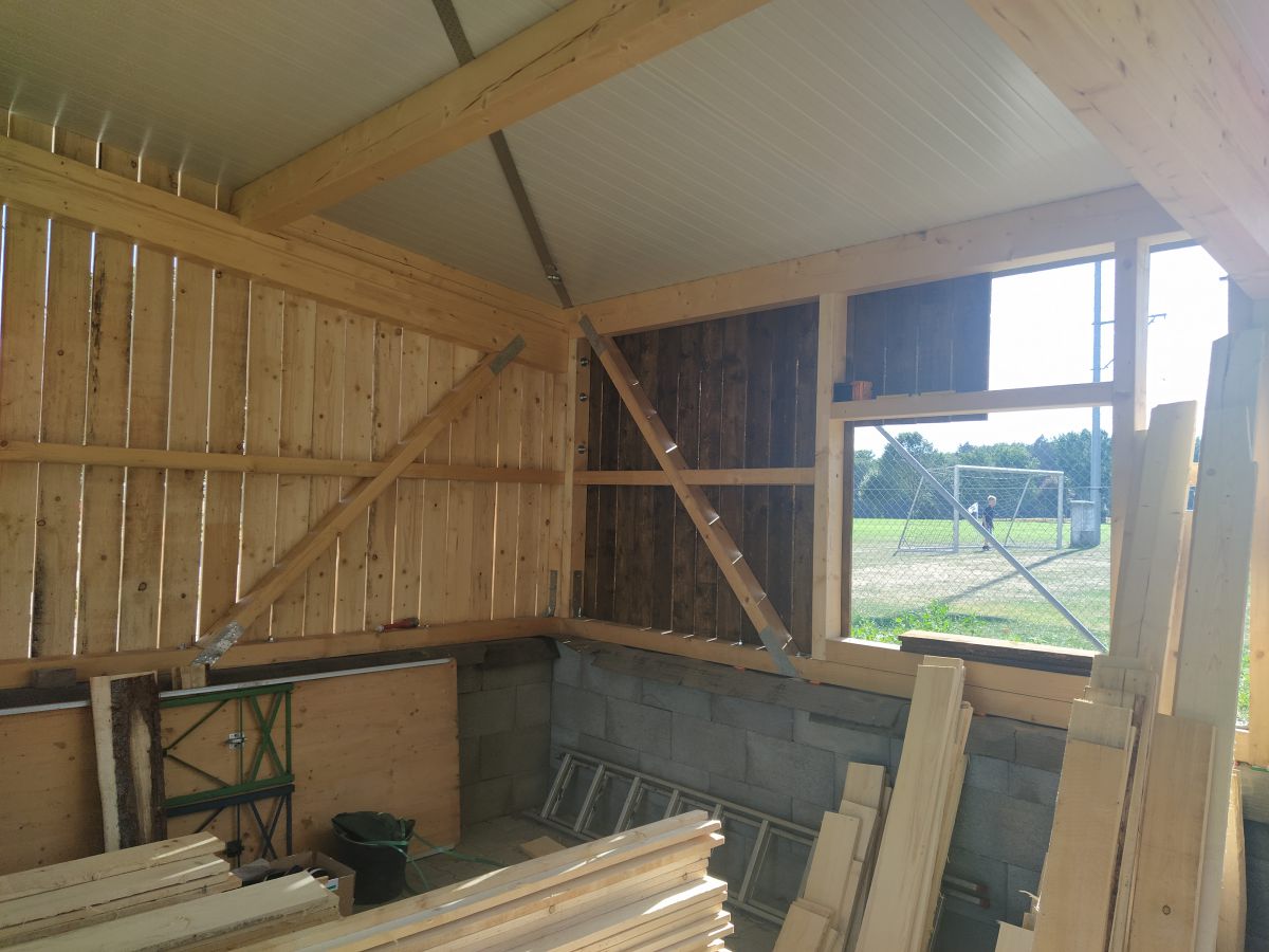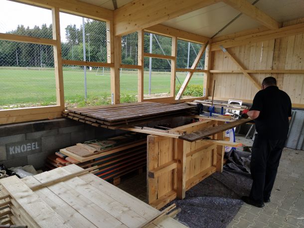 Gerade in der Sommerpause angekommen ging Holger Koch nun voller Tatendrang daran, die Fertigstellung des Schuppens bis Herbst hinzubekommen. Die vom Forstbetrieb Muth gespendeten Bäume gingen ins Sägewerk, wurden dann anschließend gesägt, in unzähligen Stunden angemalt und schließlich angebracht. Fenster und Türen wurden gesetzt und am Schluss die beiden Rolltore gefertigt und installiert. So konnte pünktlich zum einsetzenden Herbst der Schuppen in Betrieb genommen werden, so dass nun alle Maschinen dort stehen wo sie gebraucht werden, um auch in Zukunft für top gepflegte Rasenplätze auf unserem Sportgelände zu sorgen.