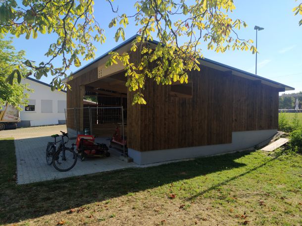Der Sportverein Ballendorf 1952 e.V. darf sich nun Besitzer eines Maschinenschuppens für seine Rasenpflegegeräte nennen. Dieser bietet Platz für unseren Spindelrasenmäher, den Aufsitzrasenmäher, den Kompakttraktor sowie alle Gerätschaften wie Kehrmaschine, Locher, Striegel, Vertikutiereinheit, etc. Wenn man den Stimmen der Mitglieder trauen darf, dann ist der überwiegende Teil sehr zufrieden mit dem Bau. Größe, Architektur, Eingliederung ins Landschaftsbild, alles scheint harmonisch und passend zu sein. Mit diesem Artikel wollen wir nun abschließend für alle Interessierten zusammenfassen, wie es zum Bau kam und welche Hindernisse „umschifft“ werden mussten.